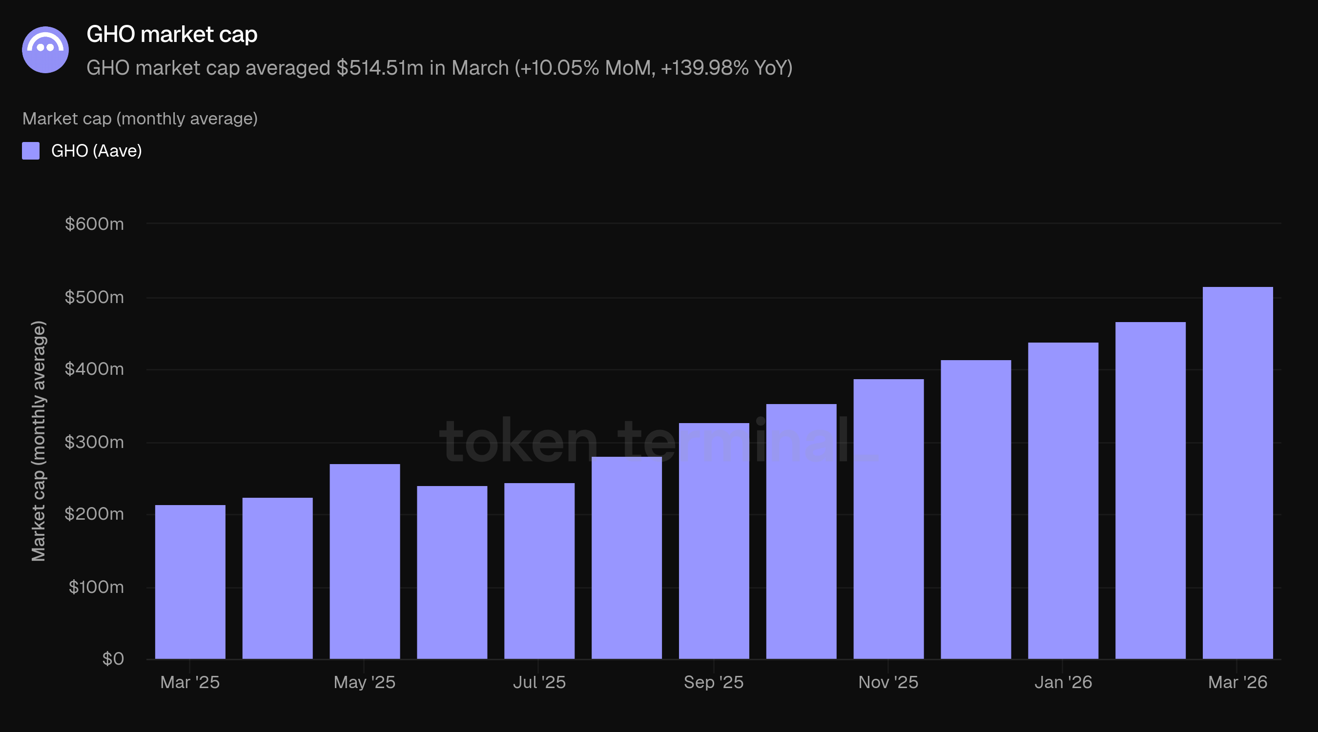 GHO market cap measures the circulating market capitalization of GHO, Aave's native decentralized stablecoin. GHO is minted by borrowers using their Aave collateral, so its market cap reflects both stablecoin demand and adoption of Aave's lending markets. March GHO market cap averaged $514.51m, up 10.05% from February's $467.53m and up 139.98% from March 2025's $214.40m. GHO crossed the $500m mark for the first time during March.