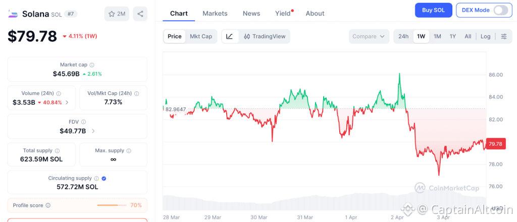 SOL trades near $79.78 as of April 2, holding above $72 support, according to CoinMarketCap. A close above $85 targets $100 first, then $120. But SOL peaked near $293 and has lost 73% since.