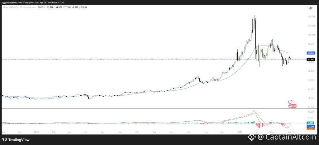 What followed was a sharp and painful correction that brought the silver price all the way down to test the $60 to $65 zone. Since then, silver has bounced back and settled into a sideways consolidation phase.
