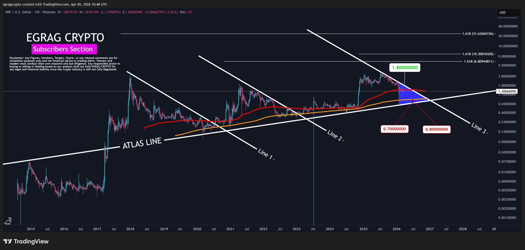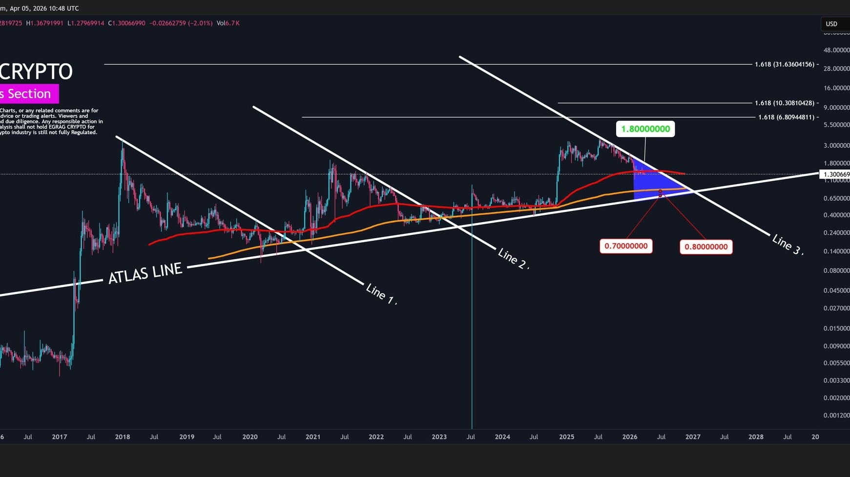 Estamos navegando sobre la Atlas Line (esa línea blanca que viene aguantando el precio desde hace años) y ahora mismo el precio está encajonado entre los $0.70 y los $0.80 . Pero ojo al dato, que el objetivo que brilla en el horizonte es ese $1.80 que todos estamos esperando ver pintado en verde. 📈