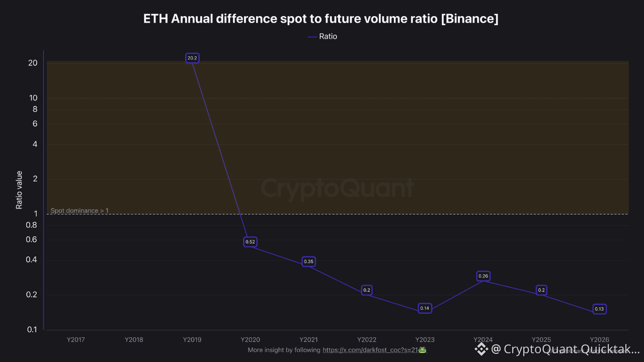 The spot-to-futures volume ratio on Binance has now dropped to 0.13, the lowest annual level ever recorded for ETH.