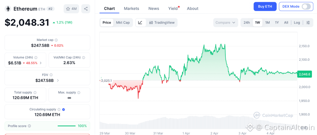 Ethereum trades near $2,048, roughly 60% below its 2025 high per CoinMarketCap.