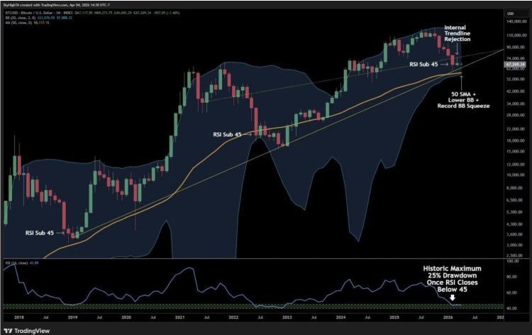 Para ponerle más picante al asunto, el RSI (el termómetro que mide la fuerza del precio) está en 43.89. En el pasado, cuando este indicador baja de 45, nos ha dado sustos de hasta un 25% de caída adicional. No es una sentencia, pero es una señal de que el mercado todavía tiene espacio para estirarse hacia abajo antes de recuperar fuerzas. 📉