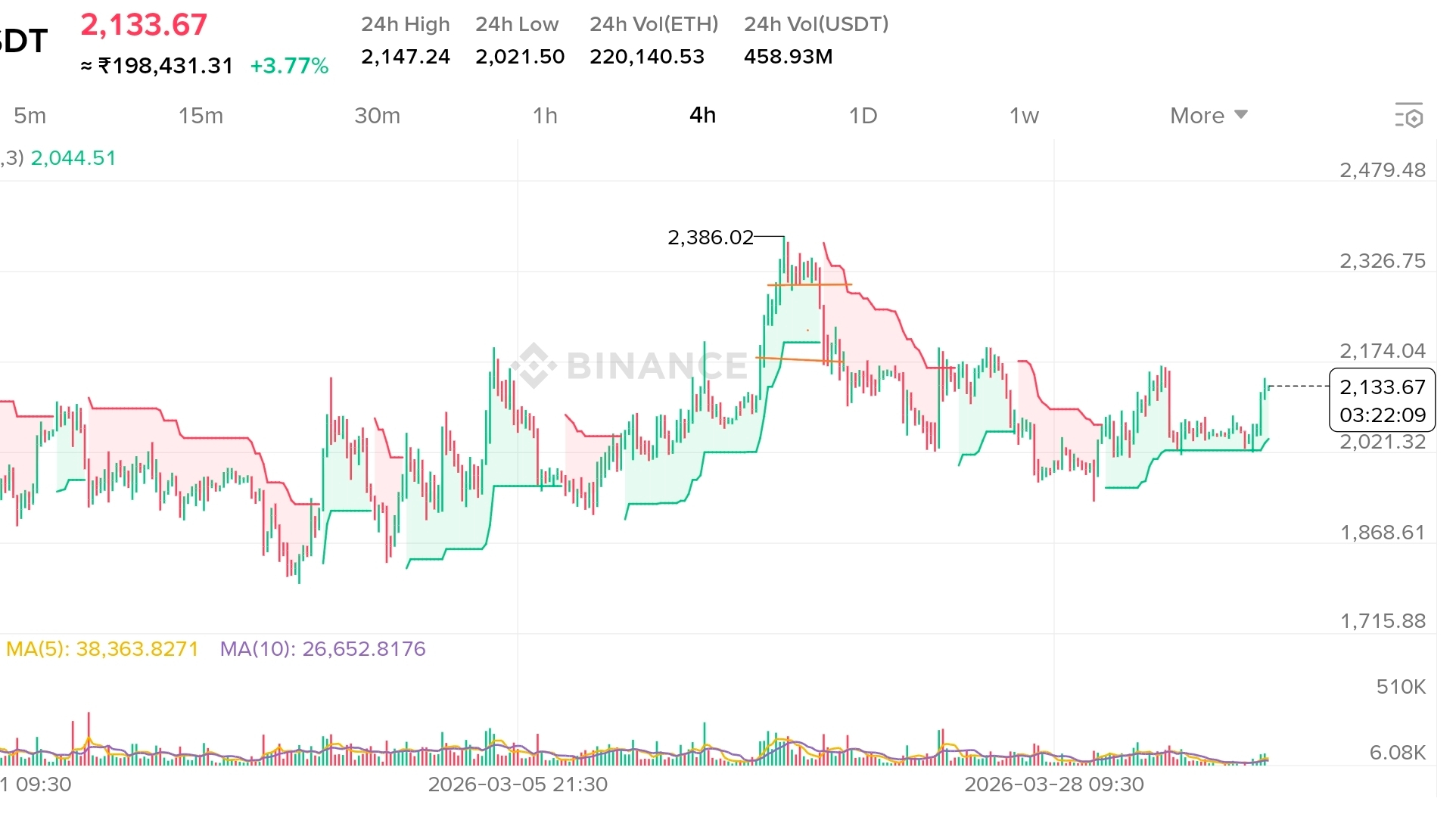 Price Action: एथेरियम वर्तमान में $2,133 के आसपास ट्रेड कर रहा है। हाल ही में इसने $2,021 के सपोर्ट से अच्छी रिकवरी दिखाई है।