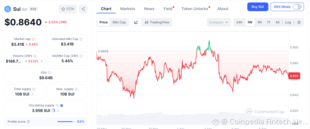 SUI trades near $0.86, down 82% from its $5.35 all time high, and is testing the $1.05 resistance zone that will determine its April direction. According to CoinPedia, the SUI price prediction targets $3 to $5 for 2026 if SUI breaks above $3.50.