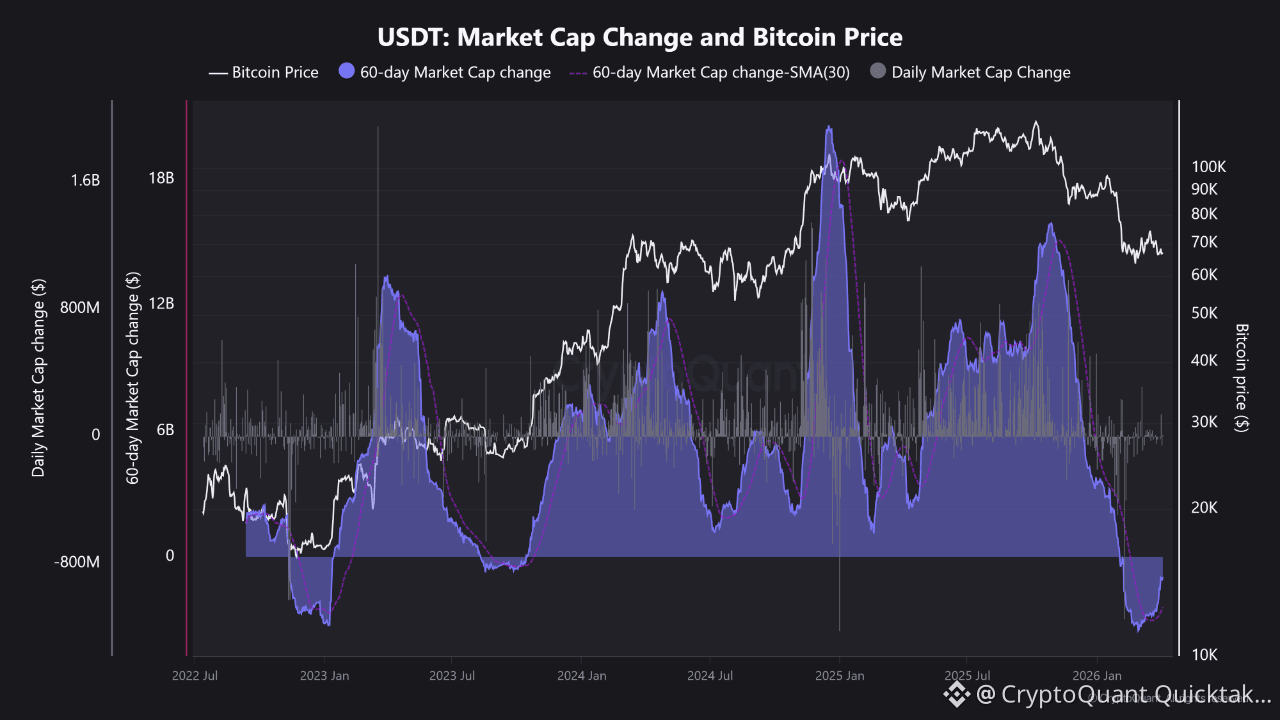 The 60-day USDT market cap change remains below zero, meaning that liquidity has not yet returned in a meaningful way, and even if prices rebound, the move is more likely to be limited or volatile rather than a strong trend continuation.
