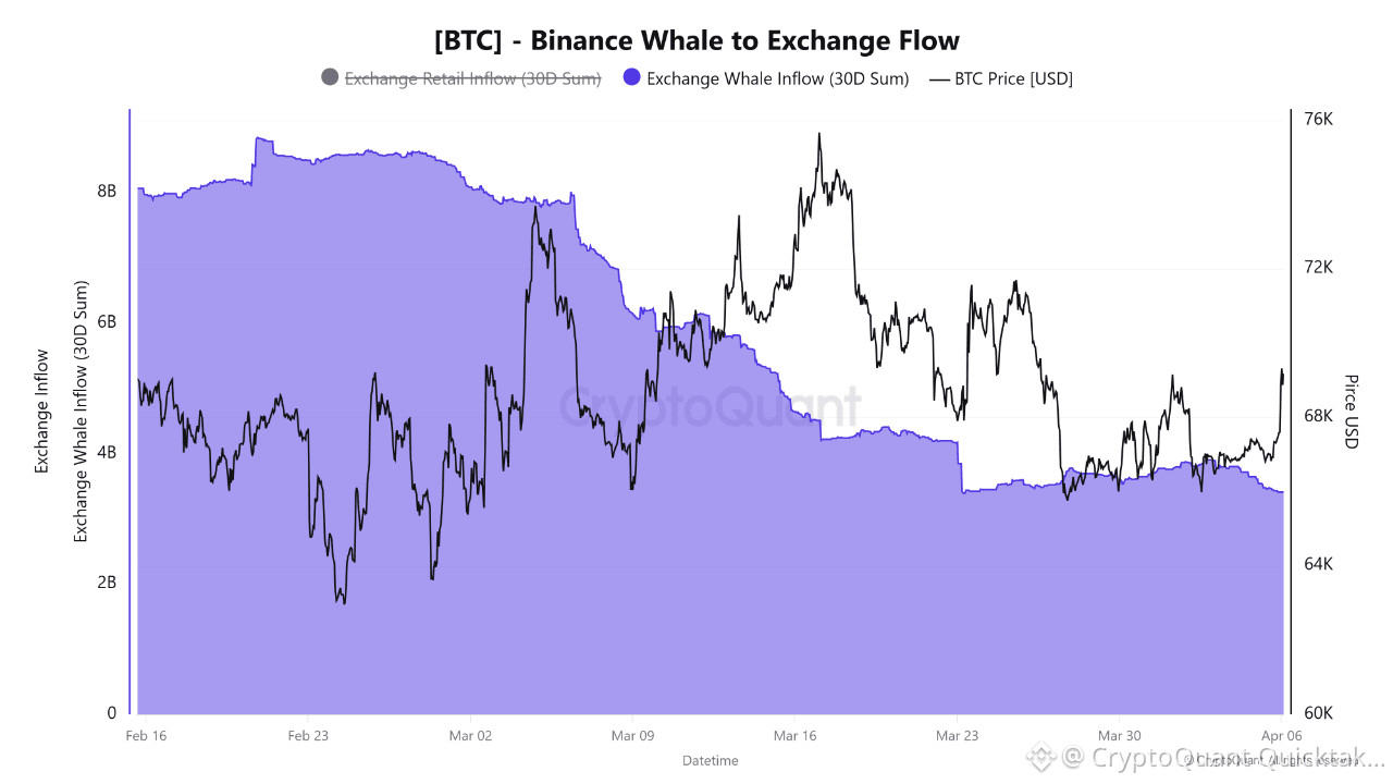 Bitcoin moved back above $69,000 while Binance whale inflows stayed near $3.4 billion, marking the second time in 14 days that Exchange Whale Inflow (30D Sum) has dropped to that level after March 23 and again on April 6.