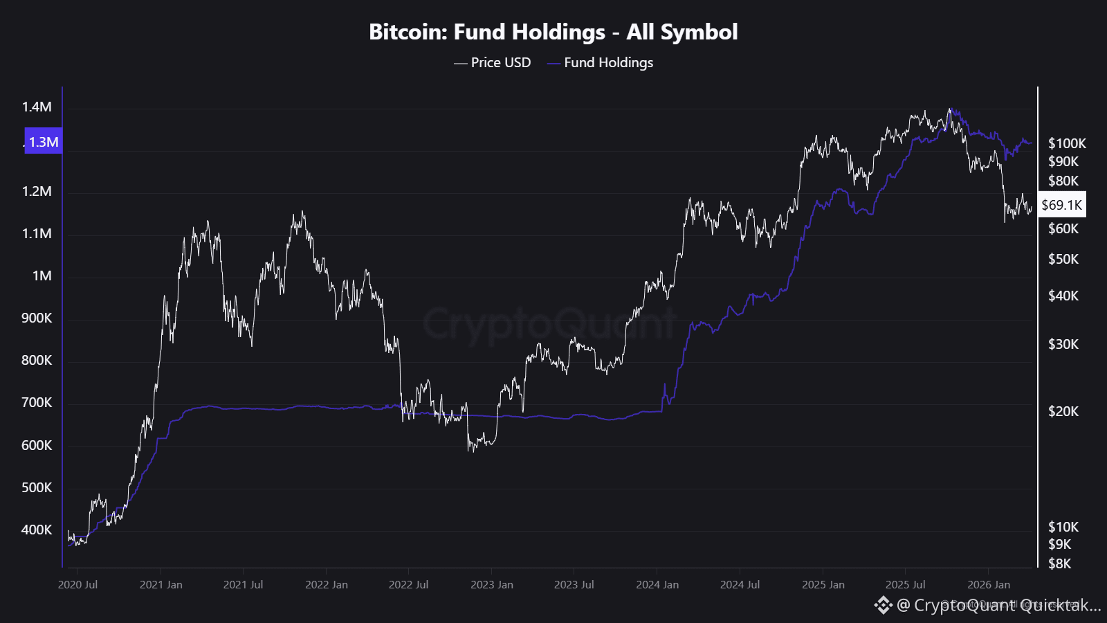 Following Bitcoin's pullback from $100K toward the $69K range, fund holdings declined only modestly. There was no broad institutional exit. Holdings stabilized near 1.3 million BTC even as price dropped significantly, which points to absorption rather than distribution.