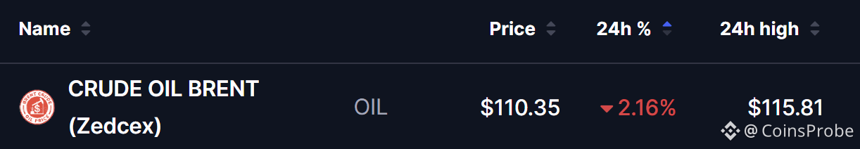 Brent Crude Oil is currently trading near $110.35, down 2.16% in the last 24 hours after facing rejection near the $115 zone. The pullback follows a strong rally that pushed oil into overbought territory, increasing the risk of a short-term correction.