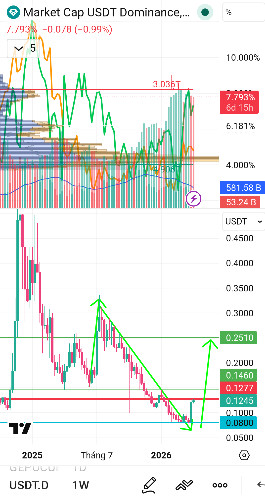 USDT.D (USDT Dominance): Ghi nhận cú sụt giảm quan trọng về 7.78% (Giảm 1.12%). Dòng tiền từ Stablecoin đang được giải phóng để thâm nhập trở lại thị trường.