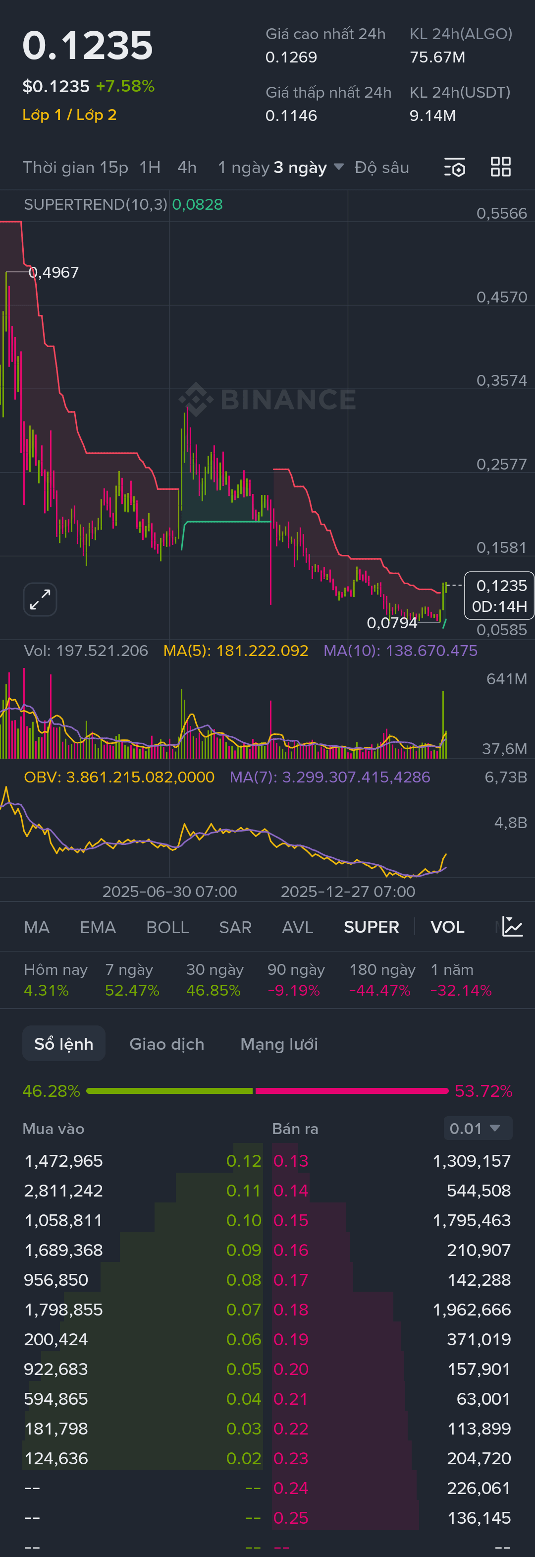 Tín hiệu đảo chiều: Trên khung 3 ngày, nến xanh thân dài đã nhấn chìm chuỗi giảm trước đó. Chỉ báo SuperTrend (10,3) đang ở vùng 0.0828, giá hiện tại đã vượt xa mốc này, củng cố xu hướng tăng ngắn hạn.