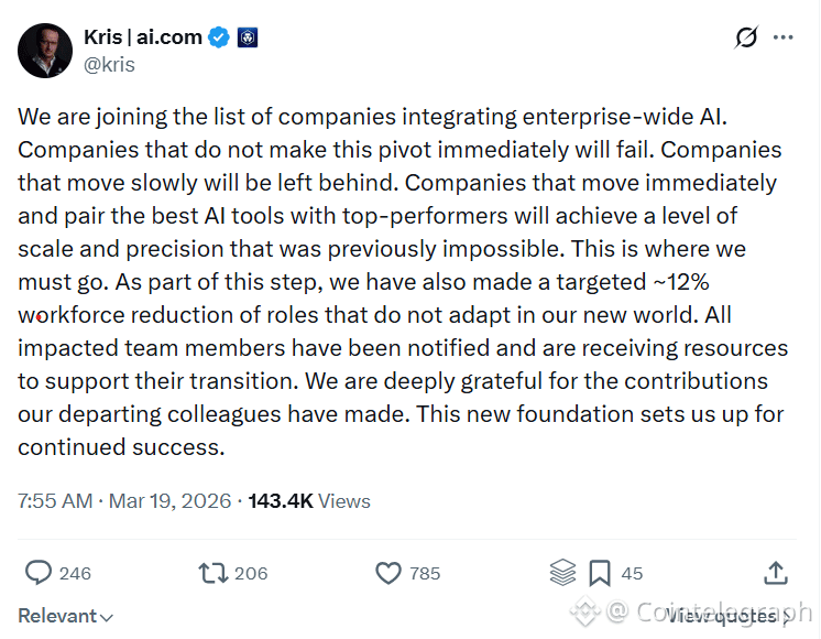 On March 19, crypto exchange Crypto.com announced a 12% workforce reduction due to AI integrations, warning that companies “that do not make this pivot immediately will fail.”