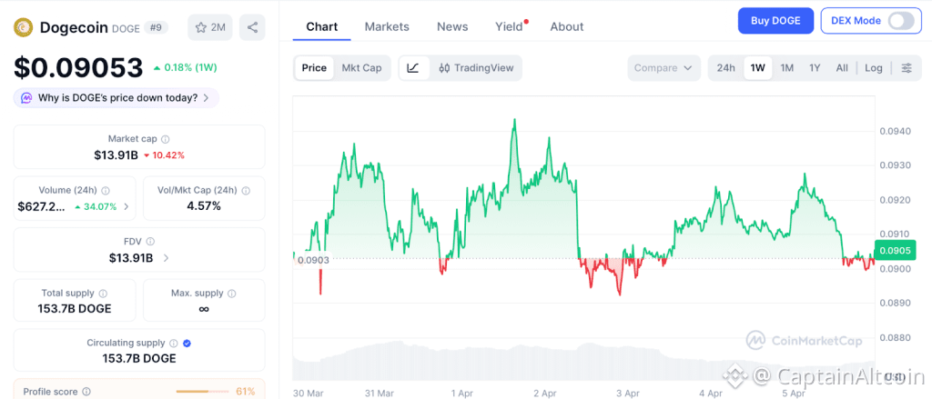 DOGE trades at $0.09 on April 5, down 87% from its $0.73 all-time high, per CoinMarketCap.