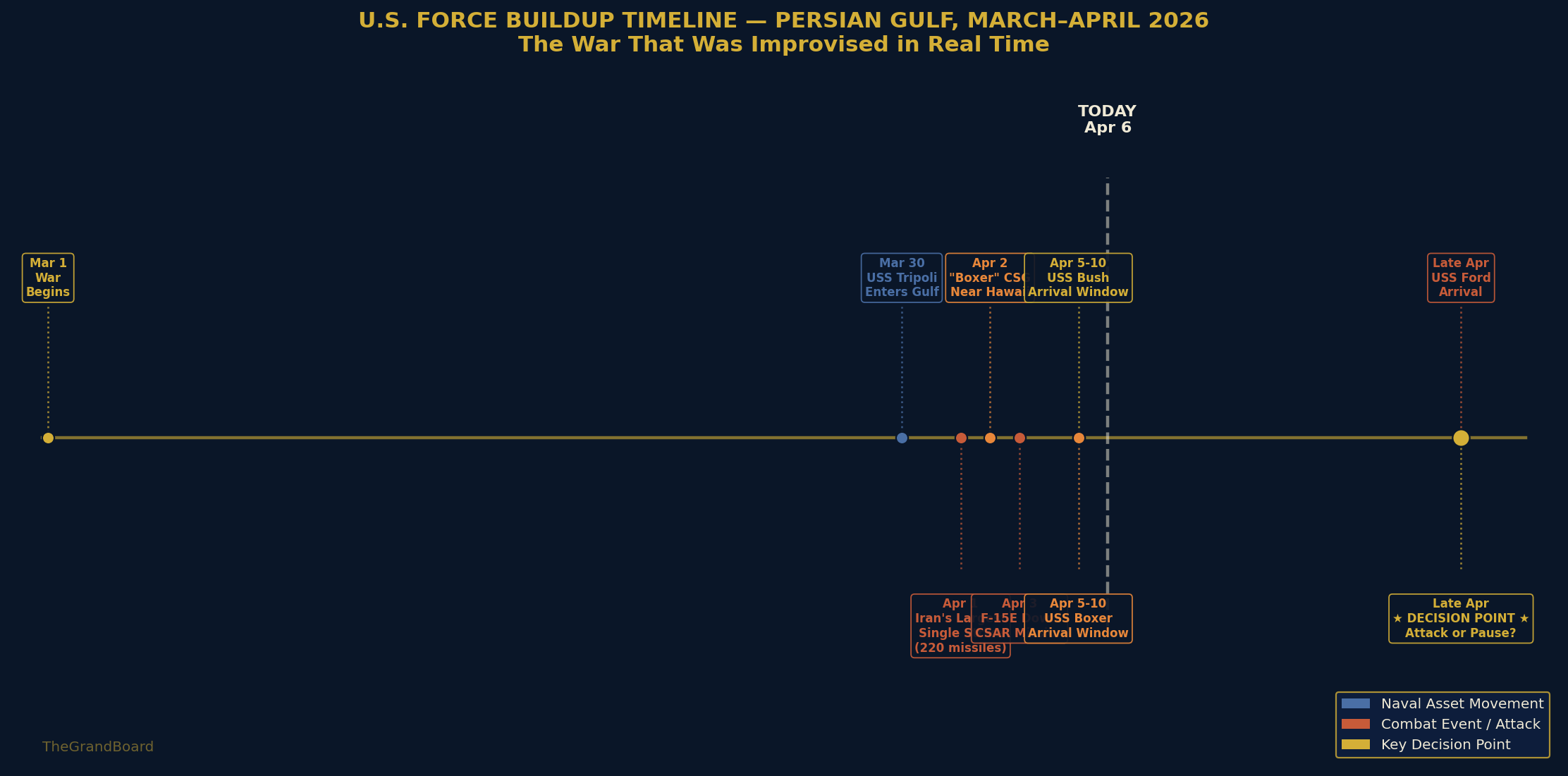 Scenario A — The Big Attack (60% probability): Late April. All three carriers on station. Trump orders a full assault on the Strait. Militarily feasible. Outcome: Iran cannot be subdued from the air. Houthi forces seal Bab-el-Mandeb. War enters Phase 2: two chokepoints closed, full global commodity shock.