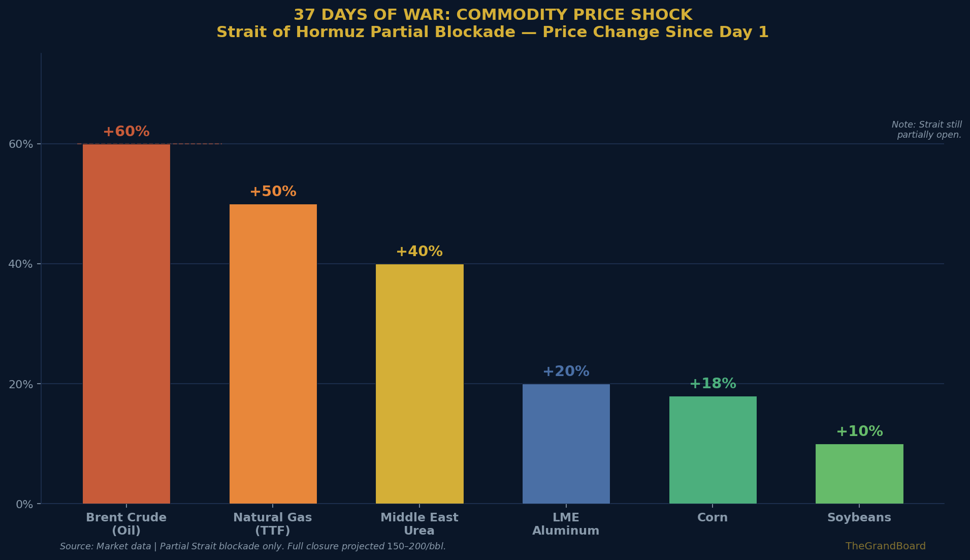 21% of global oil transits the Strait of Hormuz daily. Since Iran moved to selectively restrict passage, global commodity markets have registered the following moves over 37 days of war:
