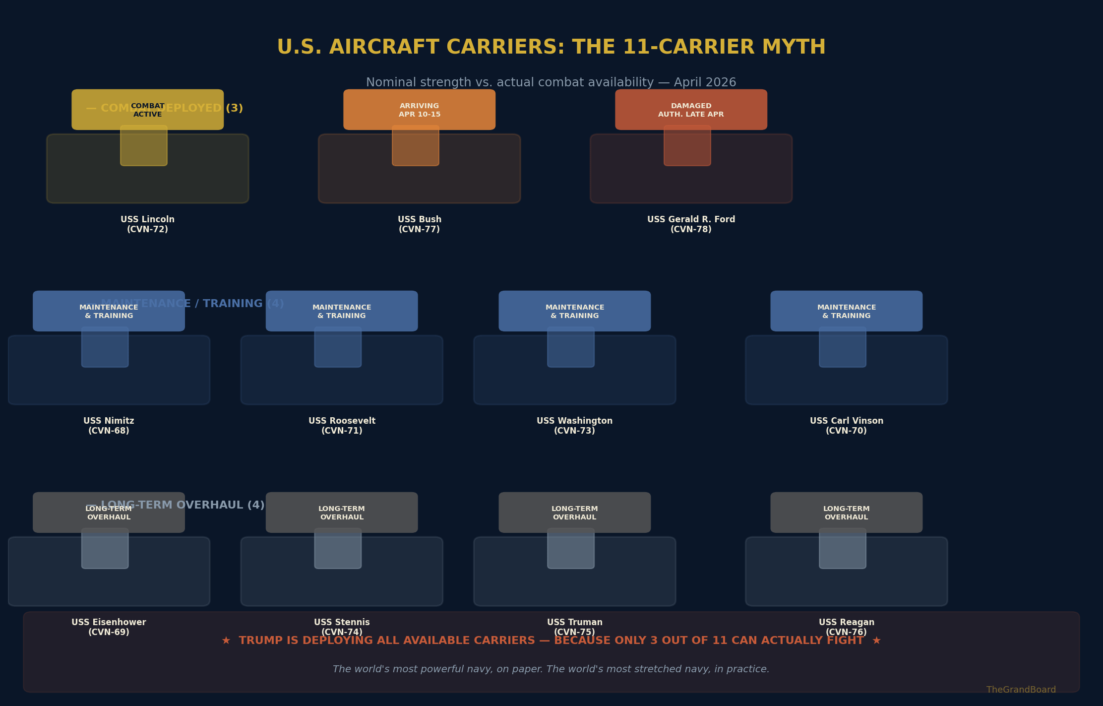 The U.S. nominally operates 11 aircraft carriers — the most of any nation on Earth, and roughly equal to the rest of the world combined. In practice, right now, in this war, three are operational.