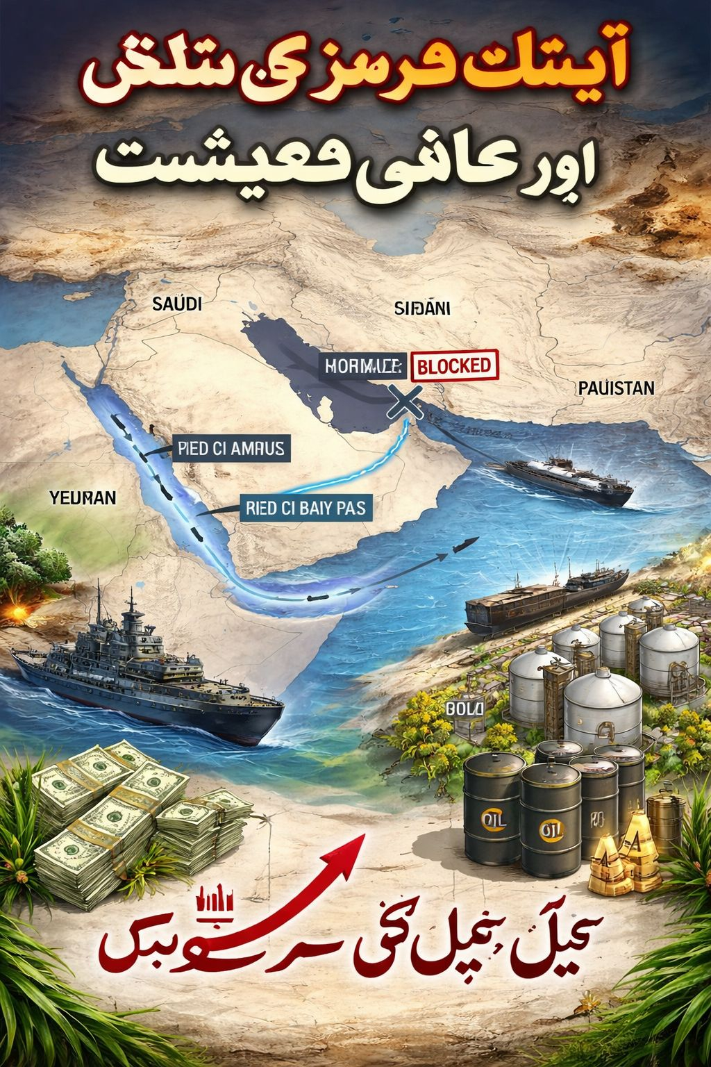 This image shows a geographical map highlighting the Middle East, especially the Strait of Hormuz, Saudi Arabia, Iran, and global oil supply routes. On this basis, a detailed Urdu article is prepared for you:
