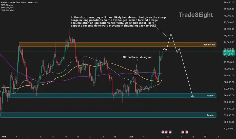 🛠 Technical Analysis: On the 4-hour timeframe, BTCUSD is showing strong short-term bullish momentum after rebounding sharply from the 68,000 area and reclaiming the moving-average cluster. Price is now pushing into the 73,000–74,000 resistance zone, which is the main barrier highlighted on the chart. This keeps the near-term structure constructive, and a brief extension higher is still possible while momentum remains strong. At the same time, the broader setup is not fully clean on the upside, because the chart still marks this area as a global bearish signal zone. The move higher also looks stretched after a fast impulse, which increases the probability of a sharp reversal once buyers start exhausting near resistance. If BTC fails to break and hold above the 73,000–74,000 range, the market can rotate lower toward the 66,000 support area first. A deeper washout could later reopen the path toward the broader 63,000–60,000 region.