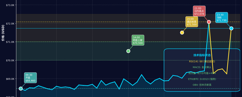 今日比特币呈现典型的"事件驱动型"上涨行情。亚市早盘依托68460美元低点快速反弹,欧市盘中突破71000美元关键心理关口,美市早盘最高触及72078美元。值得注意的是,晚间21:00后价格出现小幅回落,最低探至71269美元,显示72000美元上方存在技术性抛压。