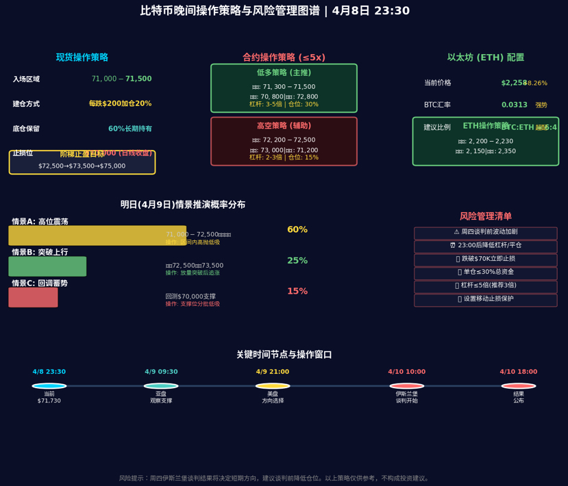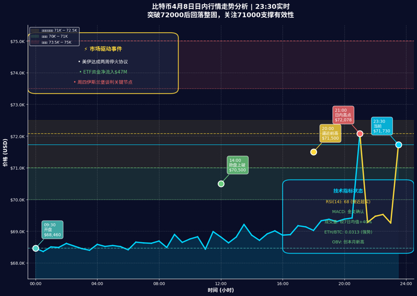 截至4月8日晚间23:30,比特币日内最高触及72078美元,现报71730美元,24小时涨幅5.49%,盘中一度突破3月18日以来新高。以太坊表现更为强势,日内大涨8.26%至2258美元。美伊停火协议引发的 risk-on 行情推动资金涌入风险资产,但特朗普晚间提议"联合管理"霍尔木兹海峡的消息引发小幅获利回吐。技术面上,BTC在72000美元整数关口遭遇心理阻力,短期进入整固阶段。建议投资者在71000-72500美元区间采取高抛低吸策略,明日重点关注伊斯兰堡谈判前的仓位调整。