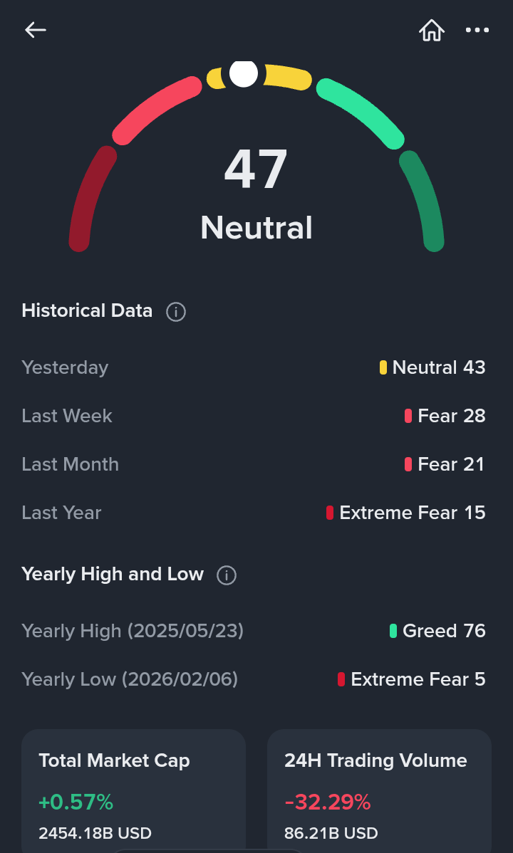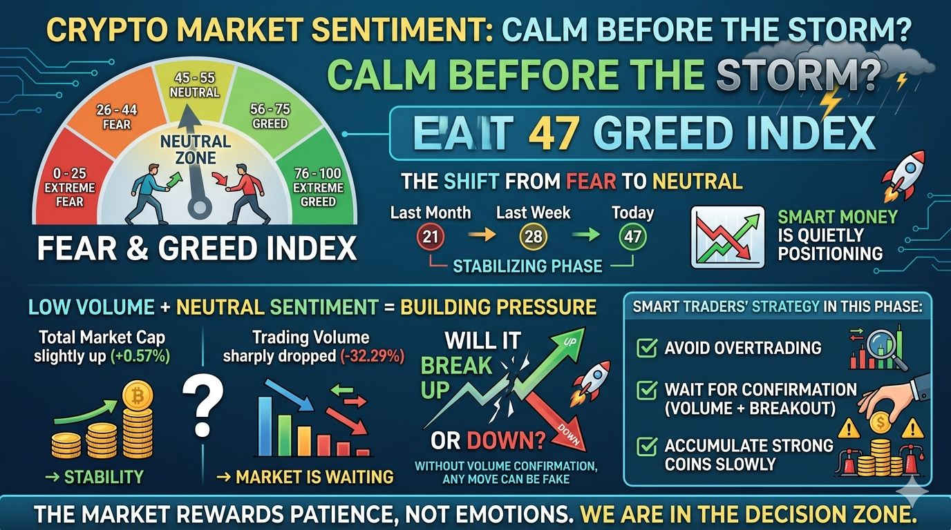 Right now, the crypto market is sitting at a Fear & Greed Index of 47, which clearly signals a neutral zone. This is the phase where neither buyers nor sellers have full control — and that’s exactly what makes it interesting.