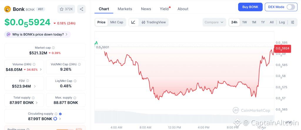 BONK airdropped to Solana wallets in late 2022 and rocketed to $0.00005924 at its peak according to CoinMarketCap, one of the fastest community-driven meme surges on any chain. It now trades at $0.0000058, down 90% from that high, with Changelly forecasting an average around $0.0000131 for 2026.