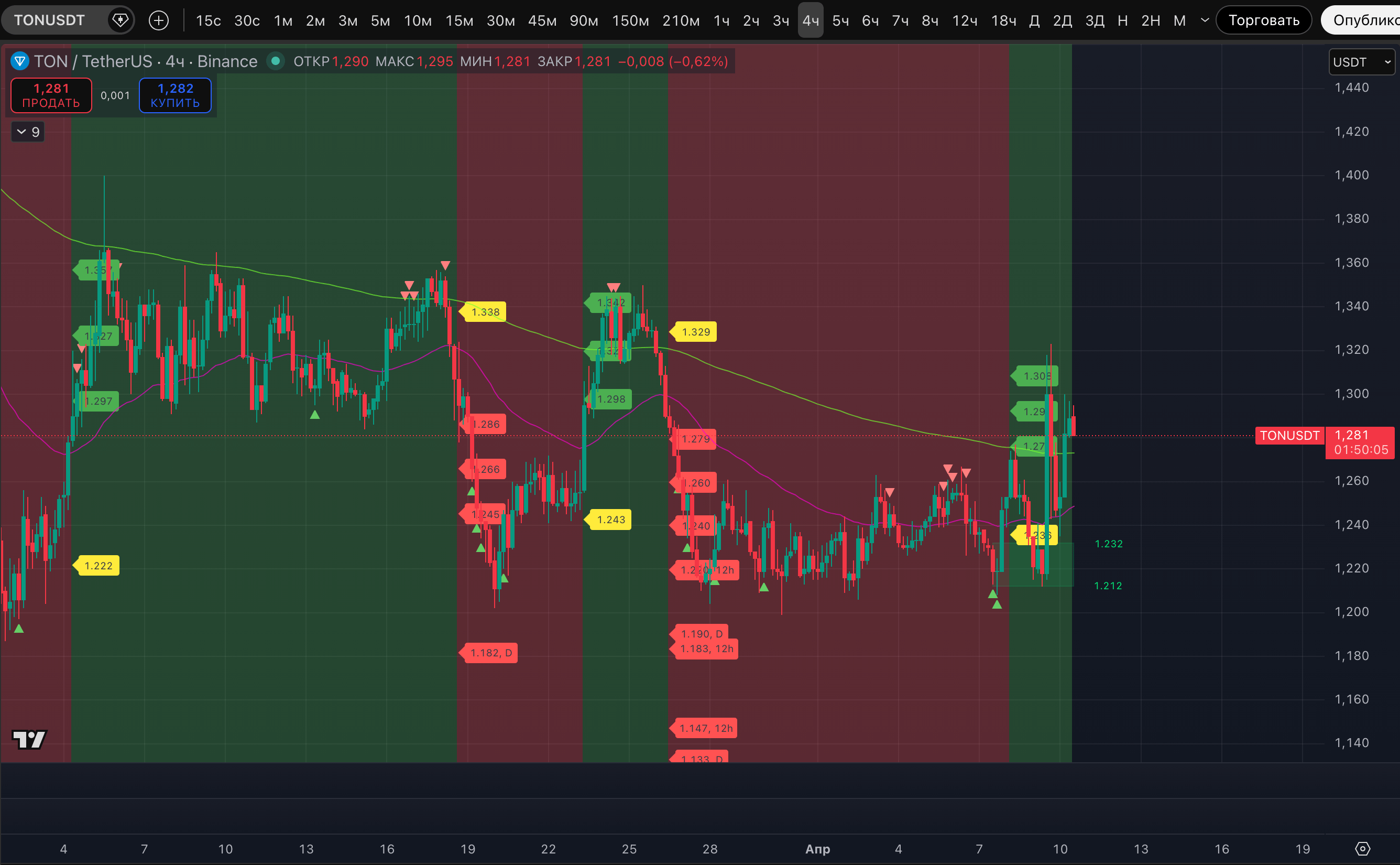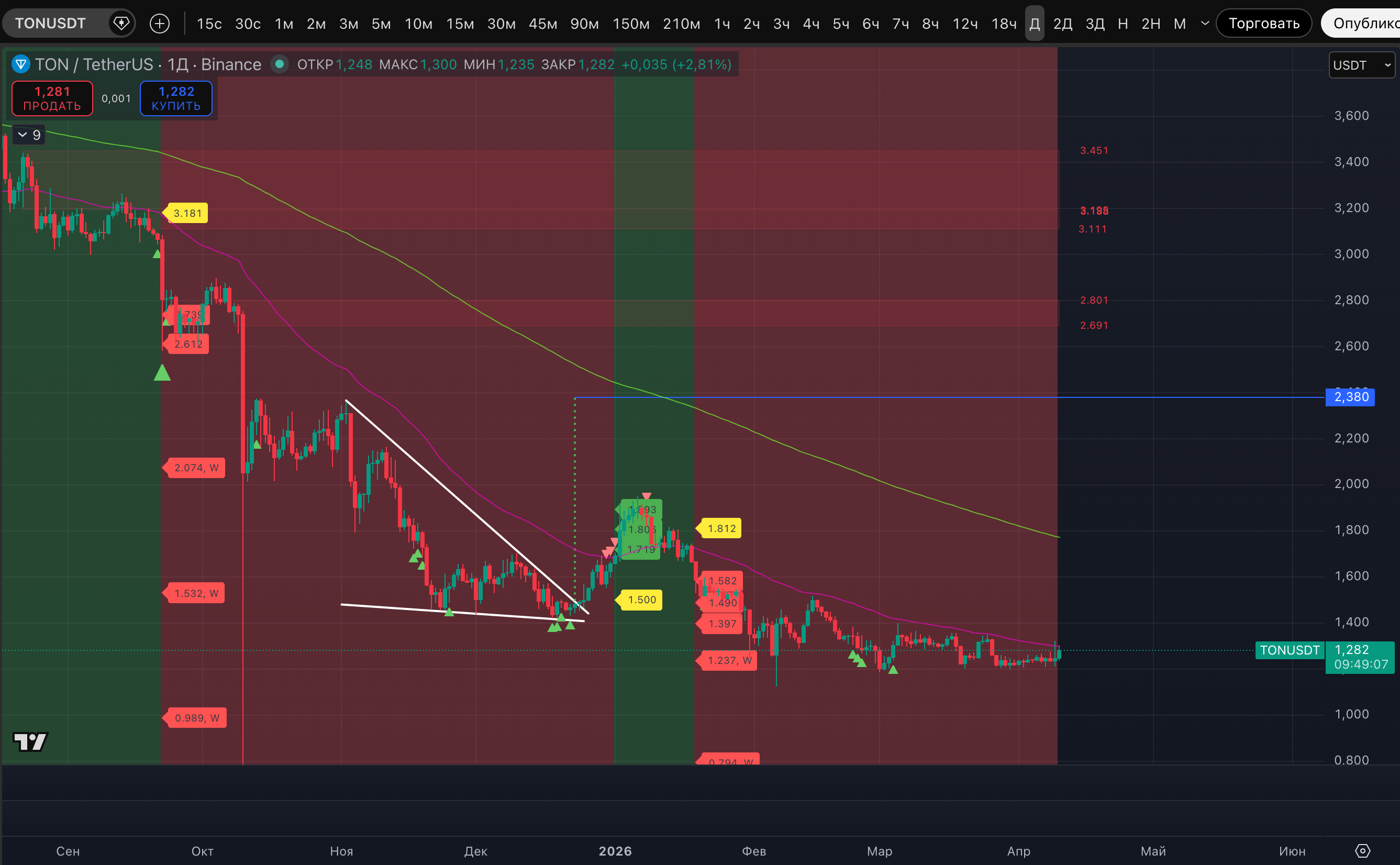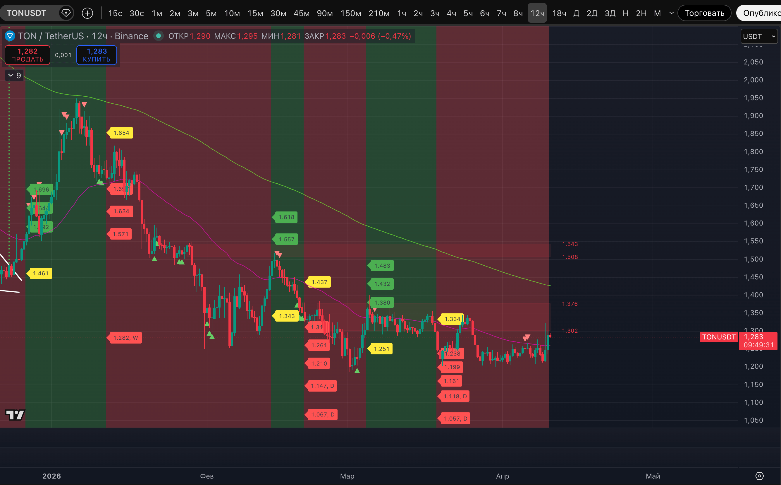 Сам #TON после роста в декабре-январе на +30% (в рамках отработки "Бычьего клина") - все еще в консолидации после болезненной коррекции января-февраля. Каких-то выразительных паттернов не видим, но цена в очередной раз поджимается к EMA 50 дневного ТФ, стабильно выступающей сопротивлением еще с дампа октября 2025. И если цена снова покажет ее пробой плюс покажет переход в устойчивый аптренд на 12-часовом и дневном ТФ - среднесрочно перспективой будет именно рост, как минимум к базовыми целям и приоритетным зонам ликвидности, которые покажет индикатор.
