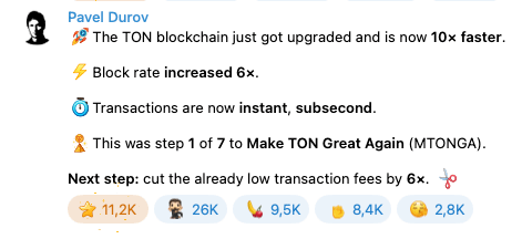 - 9 апреля: блокчейн TON обновился и стал в 10 раз быстрее, частота блоков выросла в 6 раз, транзакции проходят почти мгновенно. Это названо первым из 7 шагов программы "Make TON Great Again" (MTONGA). Следующий шаг - снизить комиссии в 6 раз. Хотя субъективно - они и так очень низкие и мы часто пользуемся блокчейном для переводов USDT.