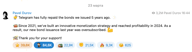 - 23 марта: Telegram полностью погасил облигации, выпущенные 5 лет назад. Речь о конвертируемых облигациях на 1 млрд $ (март 2021): деньги привлекались на развитие и операционные нужды, при этом компания сохраняла независимость и контроль.
