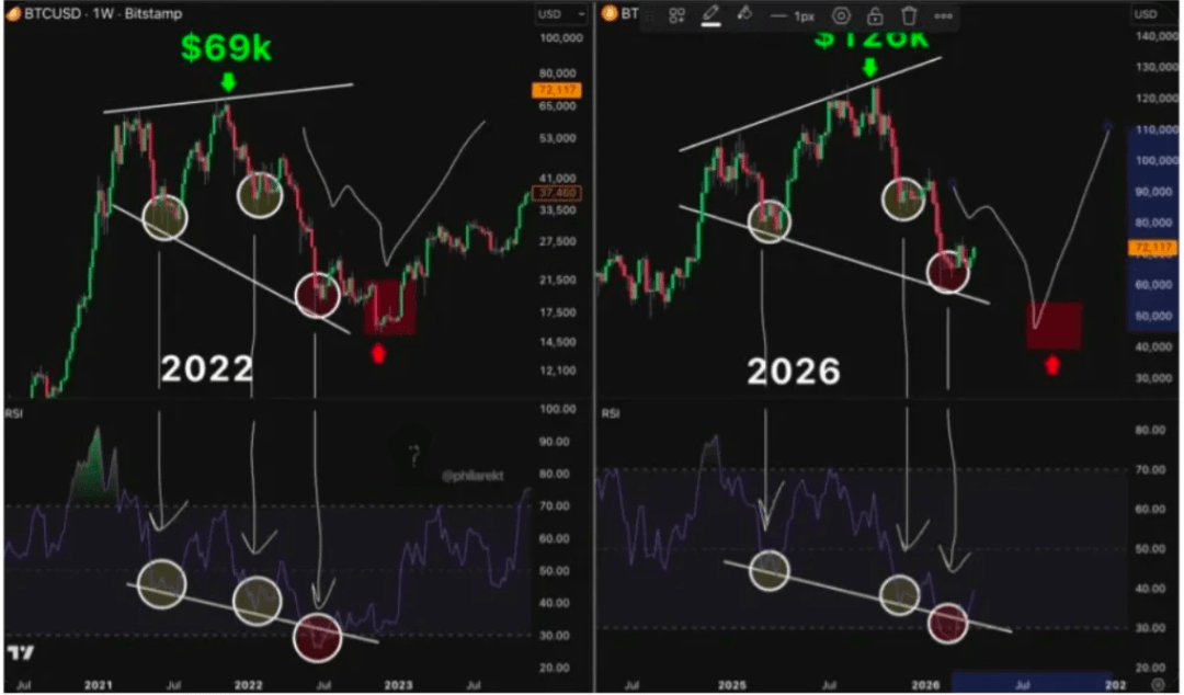 The current chart, with a cycle peak at $126,000 in October 2025, shows the same architecture forming in almost identical proportion. Both the 2022 and 2026 panels show Bitcoin respecting a slanted resistance line at the top while gradually falling within a downward channel. Each bounce fails to break out, and eventually the price has created successive lower lows.