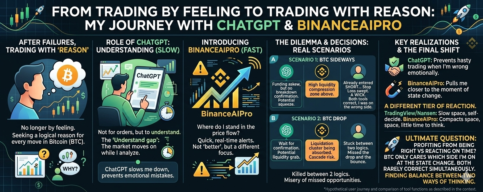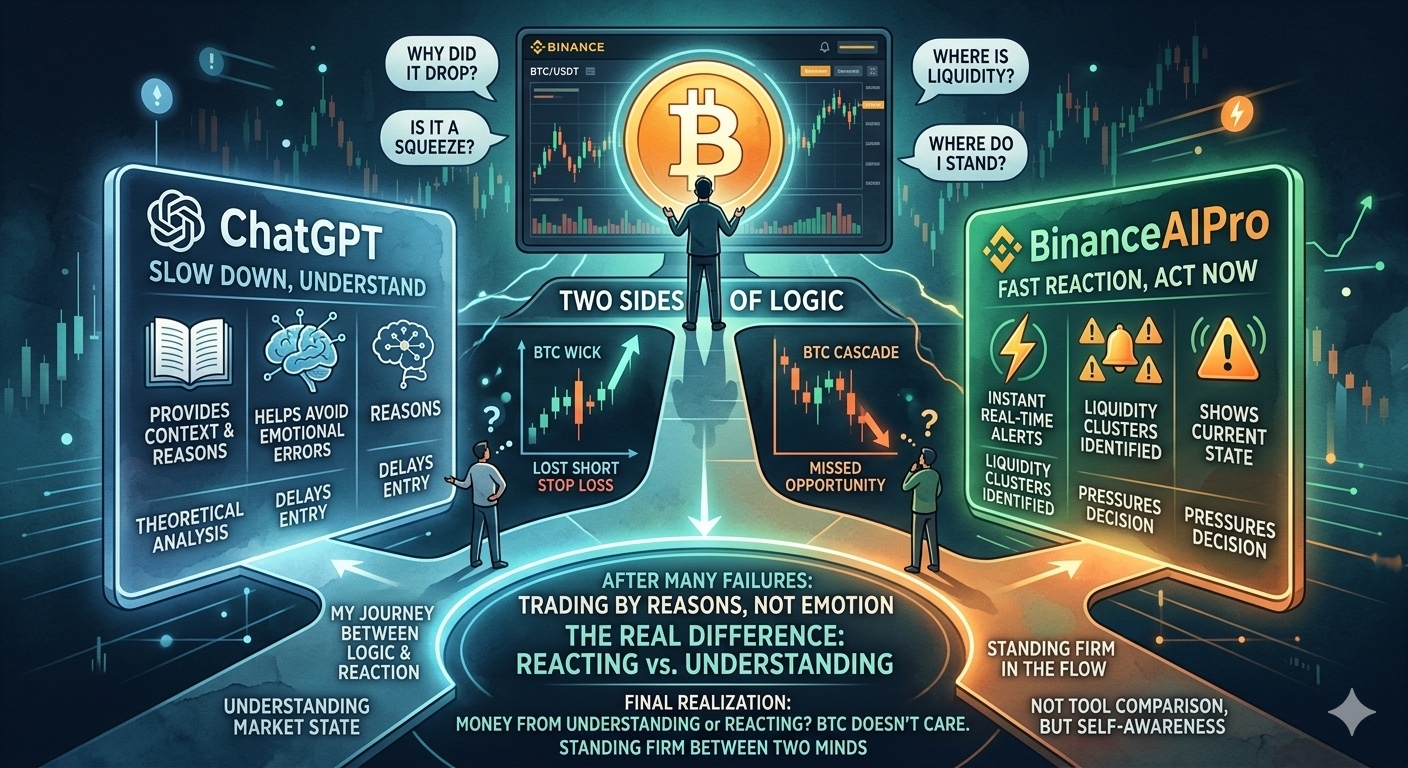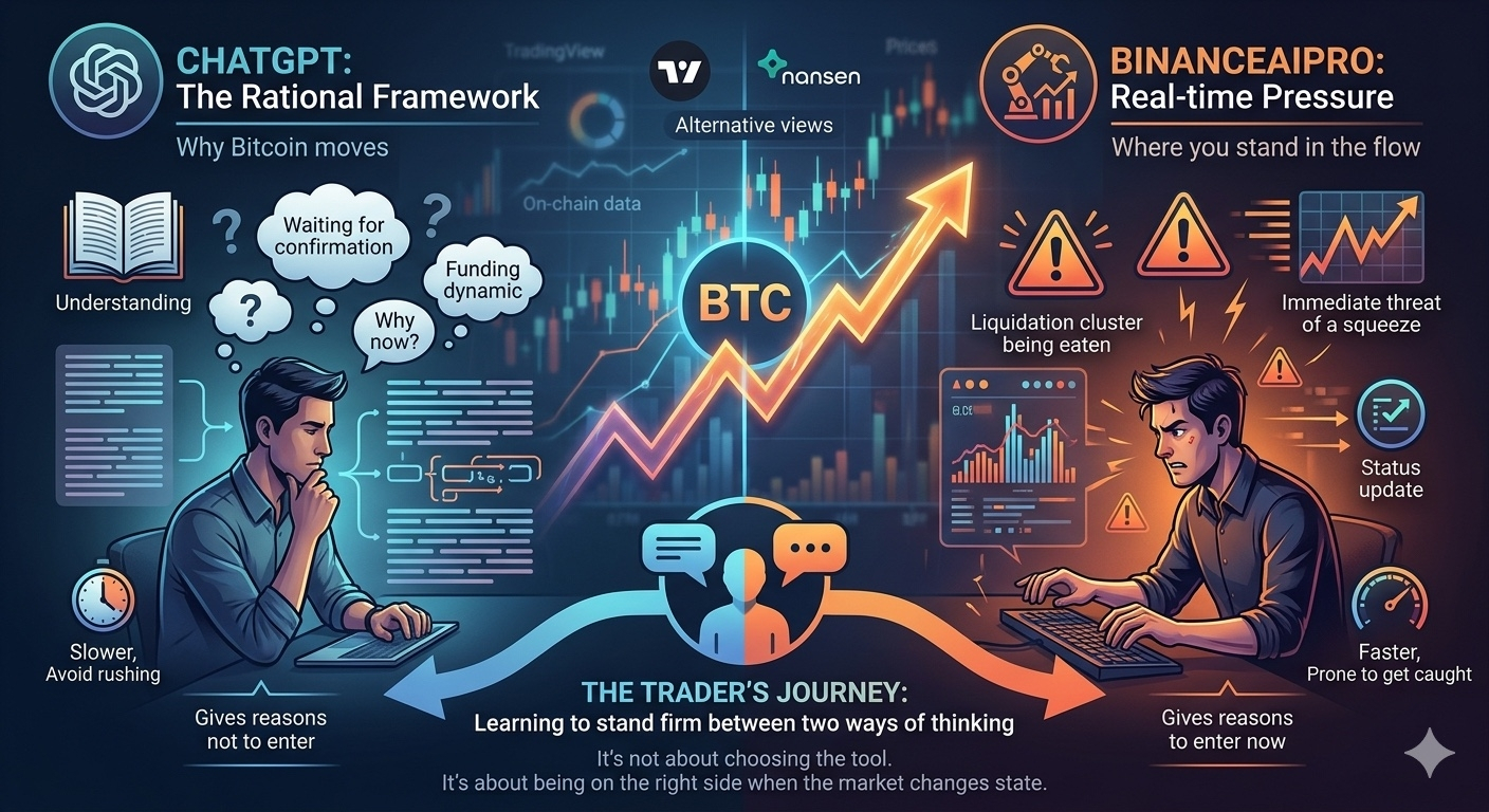 Có một điểm bắt đầu rõ dần: ChatGPT khiến mình chậm lại để tránh sai. BinanceAIPro khiến mình nhanh hơn nhưng dễ bị cuốn vào vùng chưa chắc chắn. Nhưng cái đáng nói không nằm ở đó. Mà nằm ở cách chúng “ép mình ra quyết định khác nhau trong cùng một cú move”.