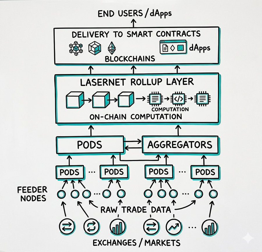 In 2025, DIA completed the full rollout of DIA Lumina, with Lasernet (an Ethereum-based oracle rollup) as its settlement layer. The architecture works like this: independent feeder nodes collect raw trade data directly from CEXs and DEXs and compute source-level prices. That data is submitted to Lasernet, where Pods store it on-chain and Aggregators apply configurable rules to produce the final price. Every step of that process is on-chain and auditable.