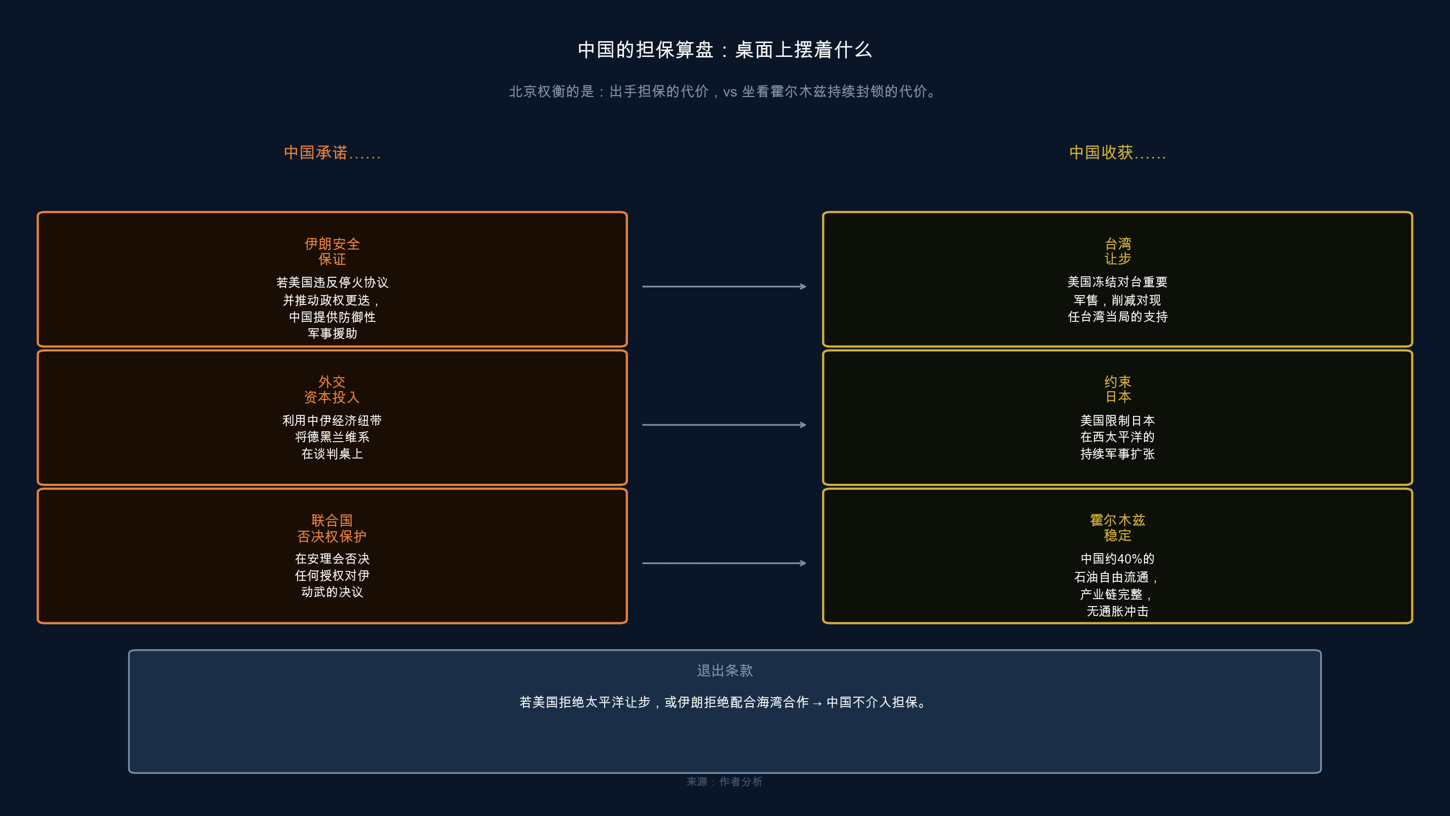 第三——这是关键的退出通道——如果华盛顿拒绝提供任何太平洋让步,或者德黑兰拒绝配合区域稳定工作,中国就不应介入。这个协议只有在预期收益超过可能被卷入美伊军事对抗的代价时才有意义。如果算盘打不过来,就不要打。