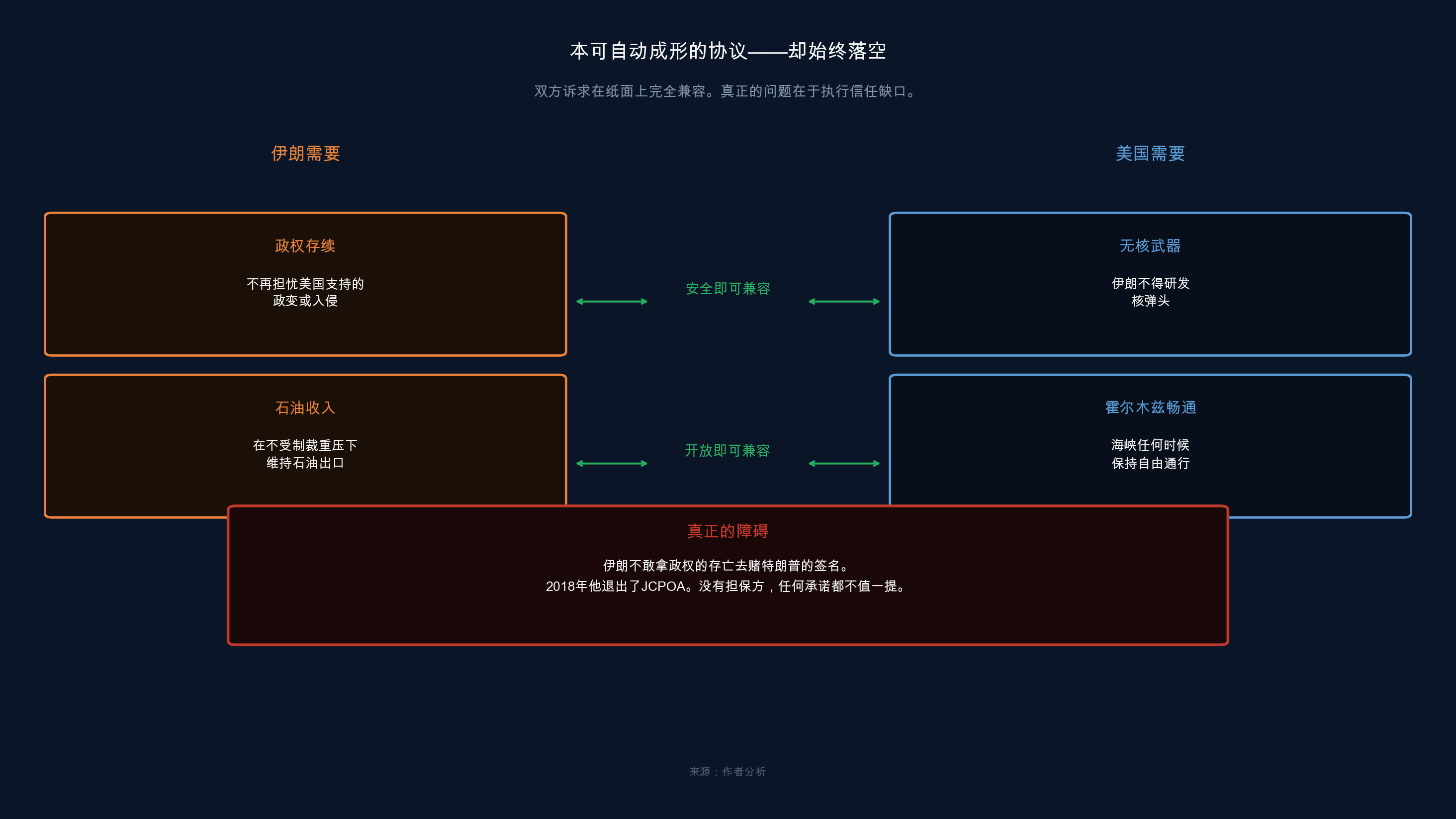 把这四个需求并排摆放,你会注意到一件奇怪的事:它们其实并不矛盾。如果伊朗不再害怕被入侵,就不需要核武器。如果伊朗保持海峡开放,美国也不需要政权更迭。在纸面上,这个协议几乎可以自动写成。