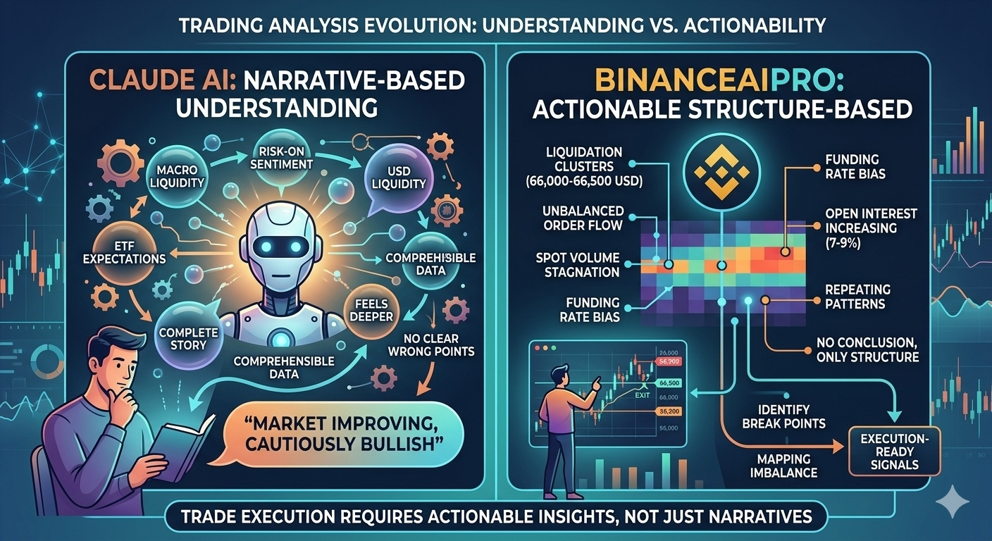 Nhìn lại cùng một dữ liệu: 65,000 USD, funding dương nhẹ, OI tăng 7–9%, spot yếu. Claude biến nó thành một câu chuyện có thể tin được. BinanceAIPro không biến nó thành gì cả.