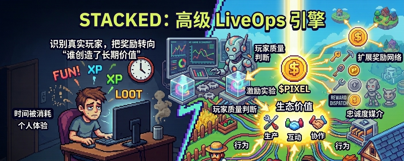 普通奖励系统只看“有没有完成任务”,所以很容易被机器人、刷子和短期套利者吃空。表面上数据很好看,实际上真实玩家没有留下来,游戏经济反而被奖励掏空。Stacked 更像是 Pixels 团队从长期运营里长出来的 LiveOps 引擎,它关心的不是“发多少奖励”,而是“奖励有没有发给对的人”。