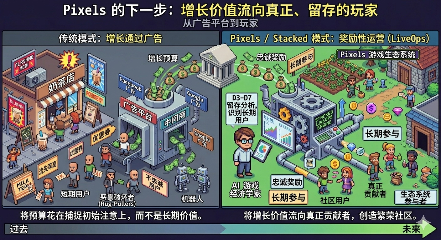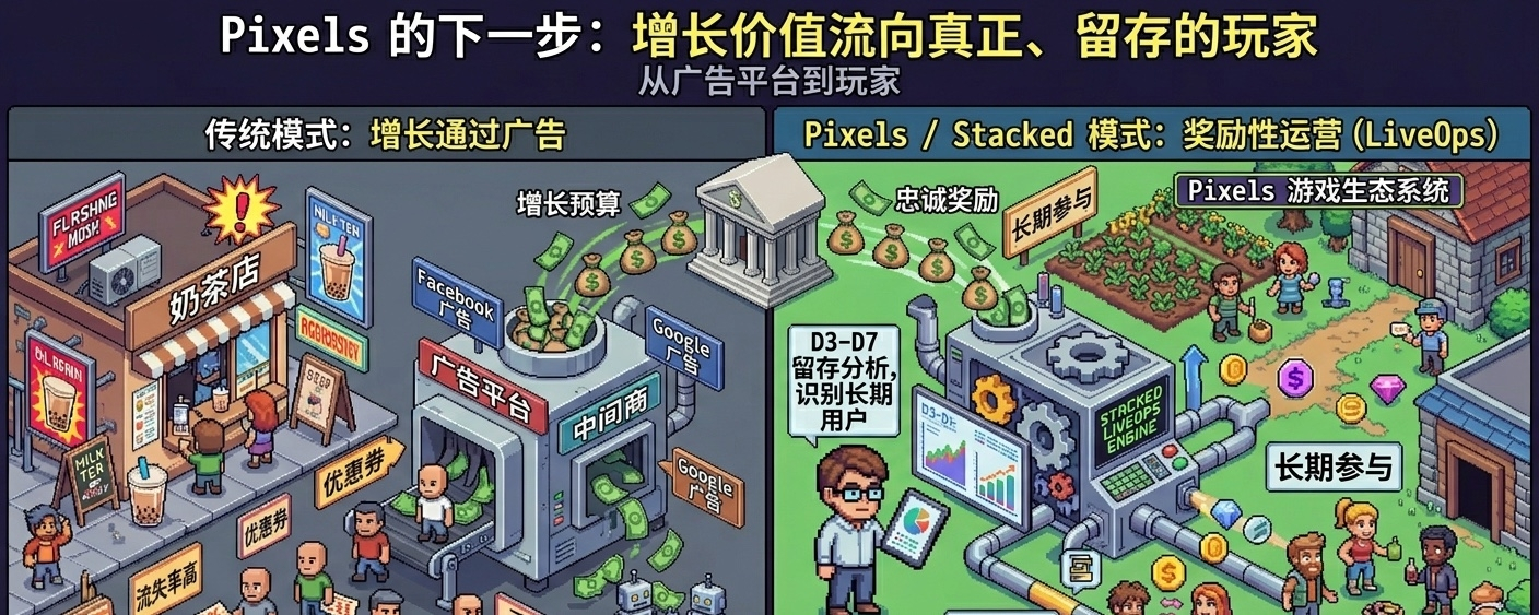 Stacked 的意义就在这里。它不是一个普通任务板,也不是简单的“做任务拿奖励”。它更像 Pixels 团队从长期实战里长出来的 rewarded LiveOps 引擎,把玩家行为、奖励实验、留存变化和收入反馈放到同一个系统里看。