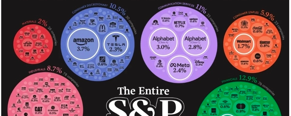 This chart shows all 500 companies in the S&P 500, sized by market cap and grouped by sector.