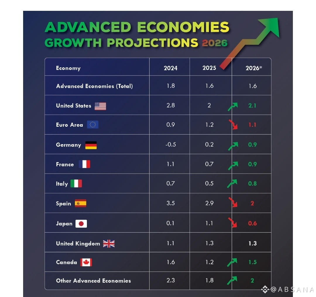 Growth in advanced economies is weak but stable. The growth rate of 1.6 percent in both 2025 and 2026 suggests these economies are avoiding recession, but they are not gaining strong momentum either.
