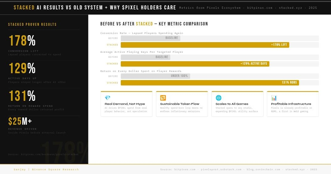 When Stacked targeted veteran players who had not spent money in over 30 days, it produced a 178 percent increase in conversion to spend. Active playing days went up by 129 percent. And the return on reward spend was 131 percent. These were real players inside the real Pixels game. Not a demo, not a paper estimate.