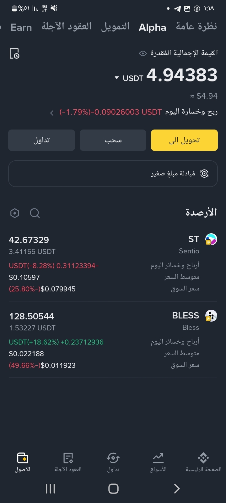 اليوم فتحت المحفظة لقيت الإجمالي صار 4.94$ فقط. يعني خسارة 50% تقريباً بيوم واحد.
