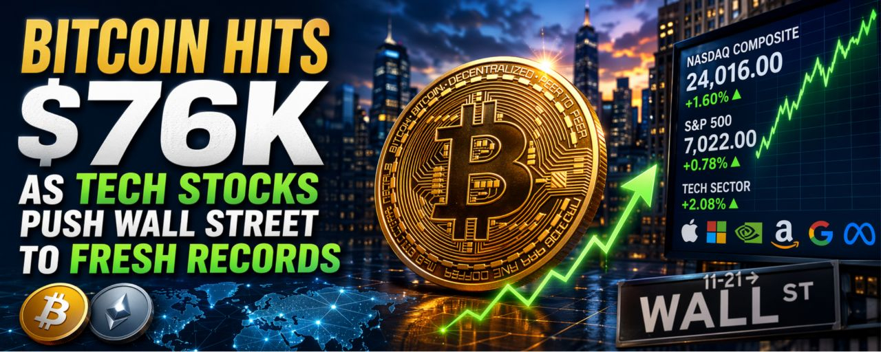 The market seemed to agree. The Nasdaq closed at a record 24,016, up 1.60%. The S&P 500 tagged 7,022, up 0.78%. Tech stocks gained more than 2% on the day. And Bitcoin briefly hit $76,000 — up roughly 1.20% in 24 hours and nearly 10% over the past two weeks. Risk assets across the board were pointing in the same direction: up.