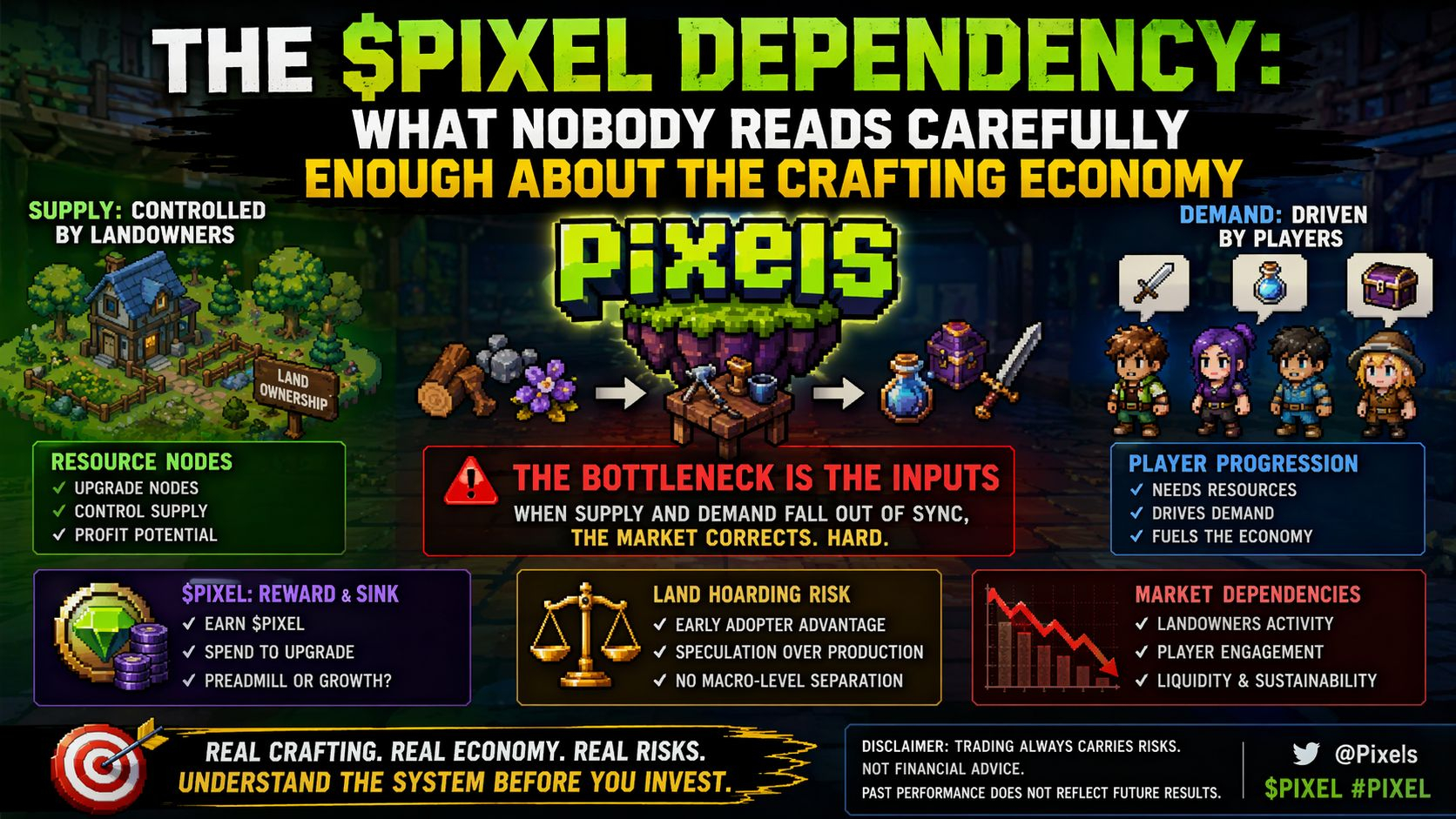 Don't get me wrong, what Pixels built is legit. Resource nodes are tied to land, recipes actually burn harvestable inputs, and the $PIXEL sinks for upgrades are real. The economy has actual interdependencies. It’s way more sophisticated than 99% of the blockchain games shipping right now.