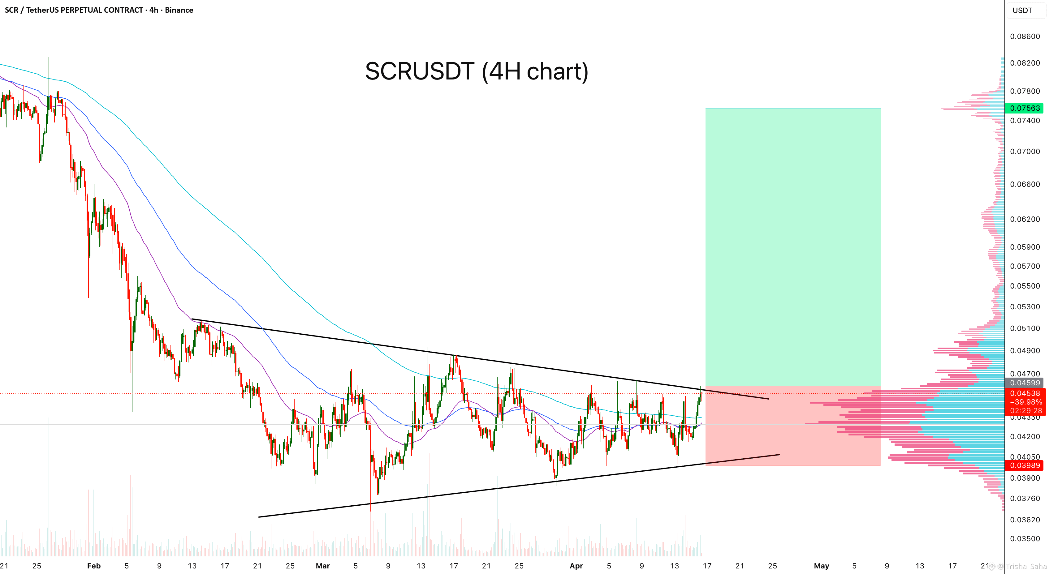 #SCRUSDT كانت تتداول داخل مثلث متناظر واضح على إطار زمني 4 ساعات بعد اتجاه هبوطي طويل. تُظهر حركة السعر انخفاضات أعلى مستمرة وارتفاعات أقل، مما يدل على ضغط تقلبات واقتراب مرحلة التوسع.