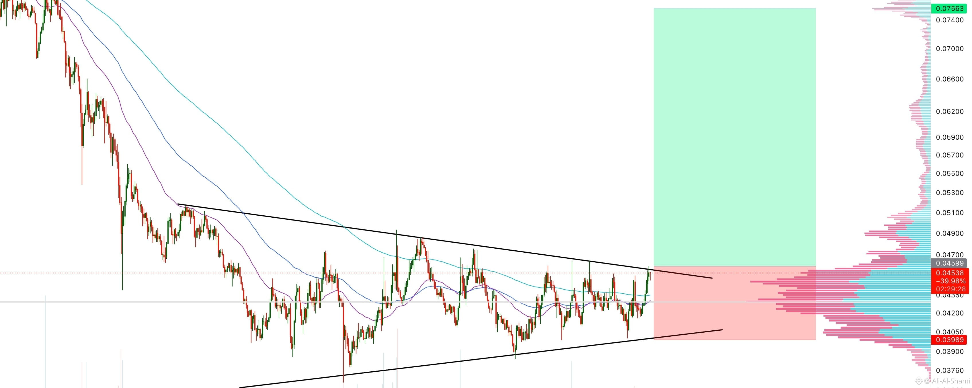 - وقف الخسارة: تحت أحدث ارتفاع أعلى / دعم المثلث (~0.0398)