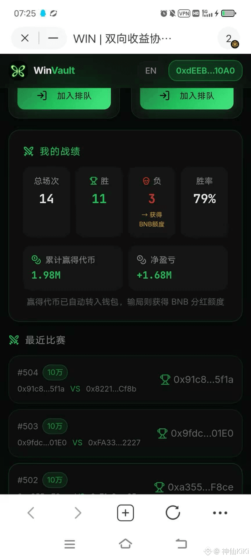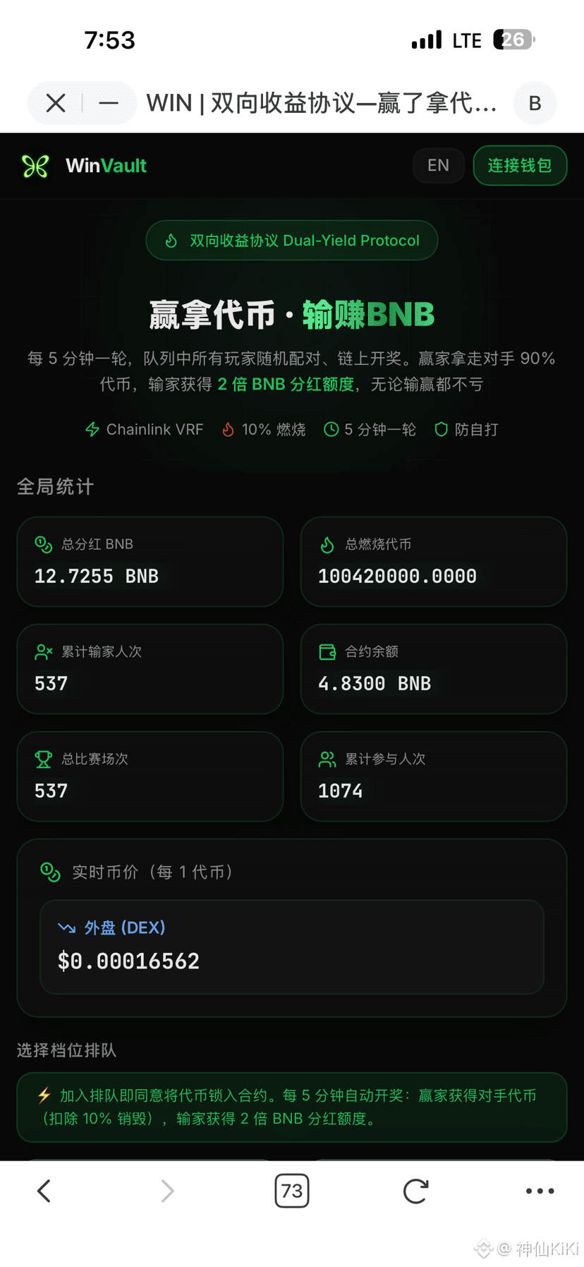 WinVault 双向收益协议 — 赢也赚,输也赚 什么是双向收益协议? 赢了 → 白拿对手的代币 输了 → 拿2倍BNB提款额度 不管结果是什么,你都在赚钱。这就是双向收益协议的核心。 赢了为什么不亏? 🌰你下注100万代币,对手也下注100万代币。 你赢了 → 你直接拿走180万代币(10%销毁了)。 你本来只有100万,现在有180万。净赚80万代币,怎么亏? 输了为什么也不亏?这才是重点。 🌰你下注100万代币,输了。 代币没了?别急。 合约马上按当时币价算出你这100万代币值多少BNB,然后直接给你开 2倍 的BNB提款额度。 比如你100万代币当时值 0.5 BNB → 合约给你 1 BNB 的额度。 你的代币才值0.5,合约给你1 BNB。你反而多拿了一倍,怎么亏? 这个BNB随时可以领,领完自动毕业。 换个方式理解: 想象你手里有100块钱的代币。 赢了 → 变成180块钱的代币。赚了。 输了 → 代币没了,但合约给你一张200块钱的BNB提款卡。也赚了。 你拿100块进来,不管输赢,出去的时候都超过100块。这就叫怎么都不亏。 那谁在"亏"? 没有人亏。钱从这里来: 每场对局销毁10%代币 → 流通减少 → 币价上涨 → 所有持币者受益 合约收到的交易税 → 分给输家的BNB额度 赢家拿的是对手的代币,不是合约出的钱 这是一个正和博弈:玩的人越多,销毁越多,币越值钱,分红池越大,所有人都在受益。 万一不想玩了呢? 开奖前随时退出,代币一分不少原路退回。 进来不亏,退出不亏,赢了不亏,输了也不亏。 公平吗? 谁赢谁输完全由 Chainlink 链上随机数决定。没有庄家,没有人能操控,代码开源链上可查。 总结: 赢了 → 净赚80%代币 输了 → 拿2倍BNB额度,反而赚更多 不玩 → 随时退出,原路退回 每场 → 10%代币销毁,越玩越稀缺 🔥 怎么都不亏,这就是 WinVault 双向收益协议。