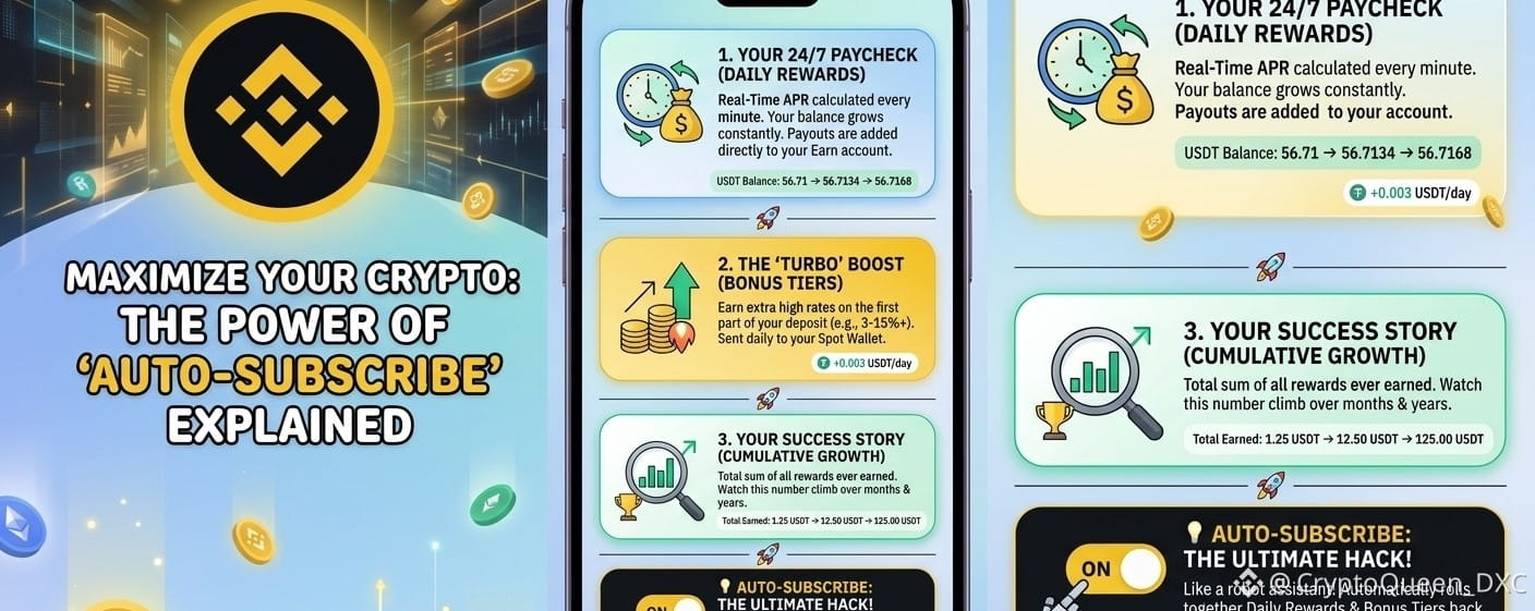 The Secret: If you don't have Auto-Subscribe ON, these bonuses sit in your Spot Wallet earning nothing. Turning it on sweeps them back into your Earn account so they can compound!