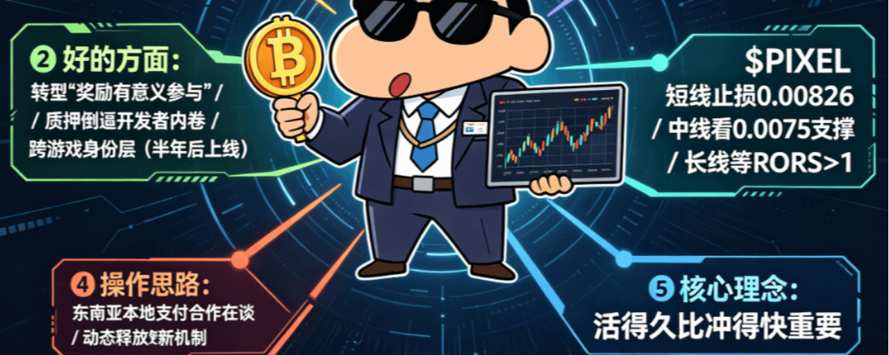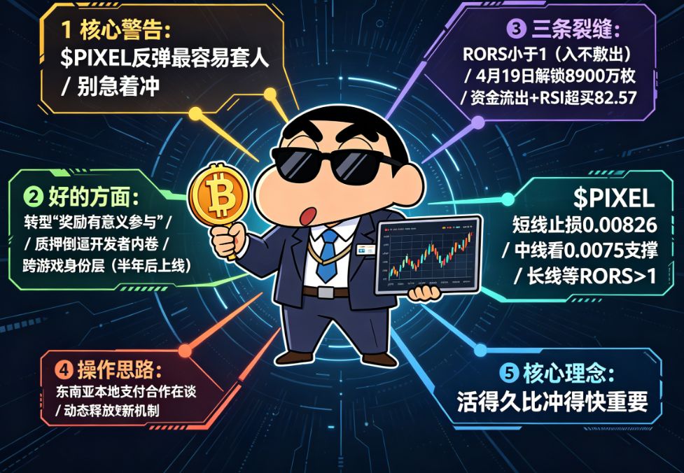 中线(未来2-4周): 解锁后的走势,取决于两个东西。第一,解锁的币有多少真的砸出来了;第二,Pixels能不能在解锁前后放出什么利好来对冲。如果没有利好硬扛,那大概率要往下找支撑。下一个能看的支撑位在0.0075附近。
