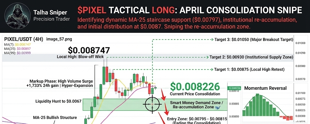 The Current Coil: We are currently pinched between the MA(7) ($0.0083) and the MA(25) ($0.0079). This "coiling" phase usually precedes a violent expansion. If $PIXEL can reclaim and close a 4H candle above $0.0084, the path to $0.0105 becomes a high-probability target.