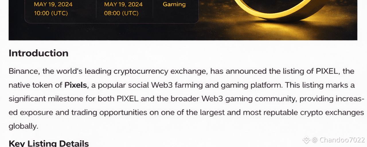 The listing also highlights the growing importance of Web3 gaming. As the gaming industry continues to evolve, more players are looking for experiences where they can earn rewards and have control over their digital assets. Blockchain technology makes this possible, and projects like Pixels are leading the way.